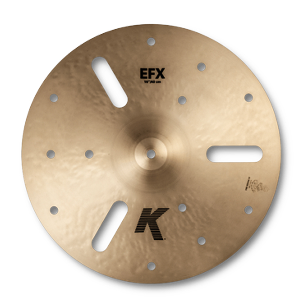 The K EFX is a darker version of the A Custom. This special effect cymbal features a unique laser “cut out” design that creates a dry, trashy sound, with sudden explosiveness and quick decay. Crash it for heavy, punctuating accents, or stack it with other cymbals to explore even more articulations, colours and effects. K EFX cymbals come in a traditional K finish and thin weight.