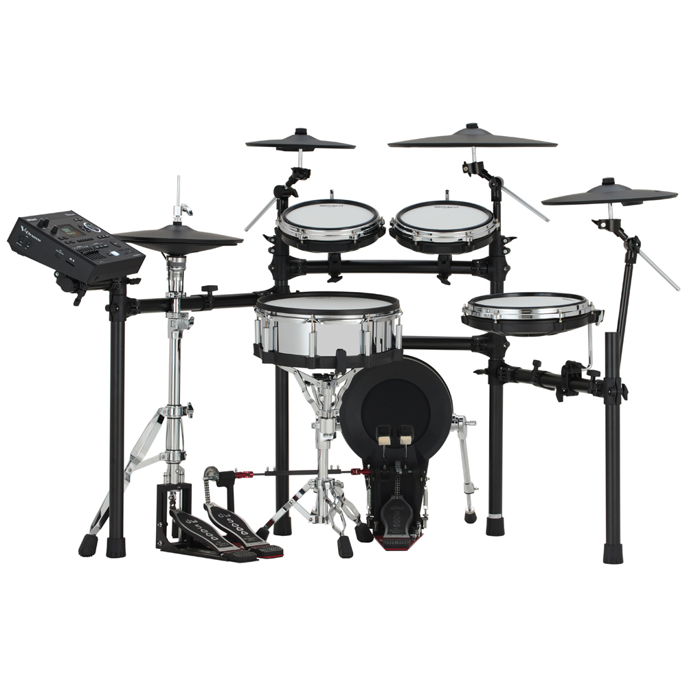 Chrome-hoop toms with inset rims for comfort and multi-sensor design for consistent, natural response.