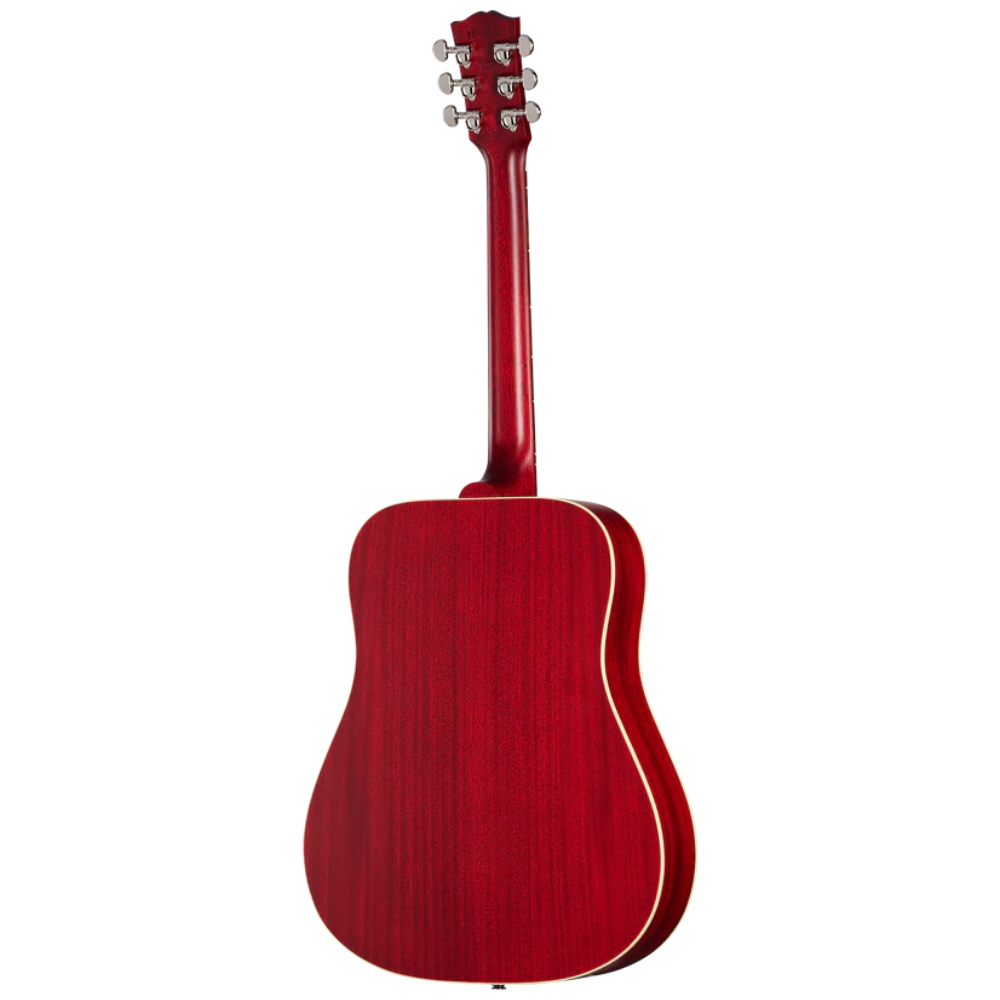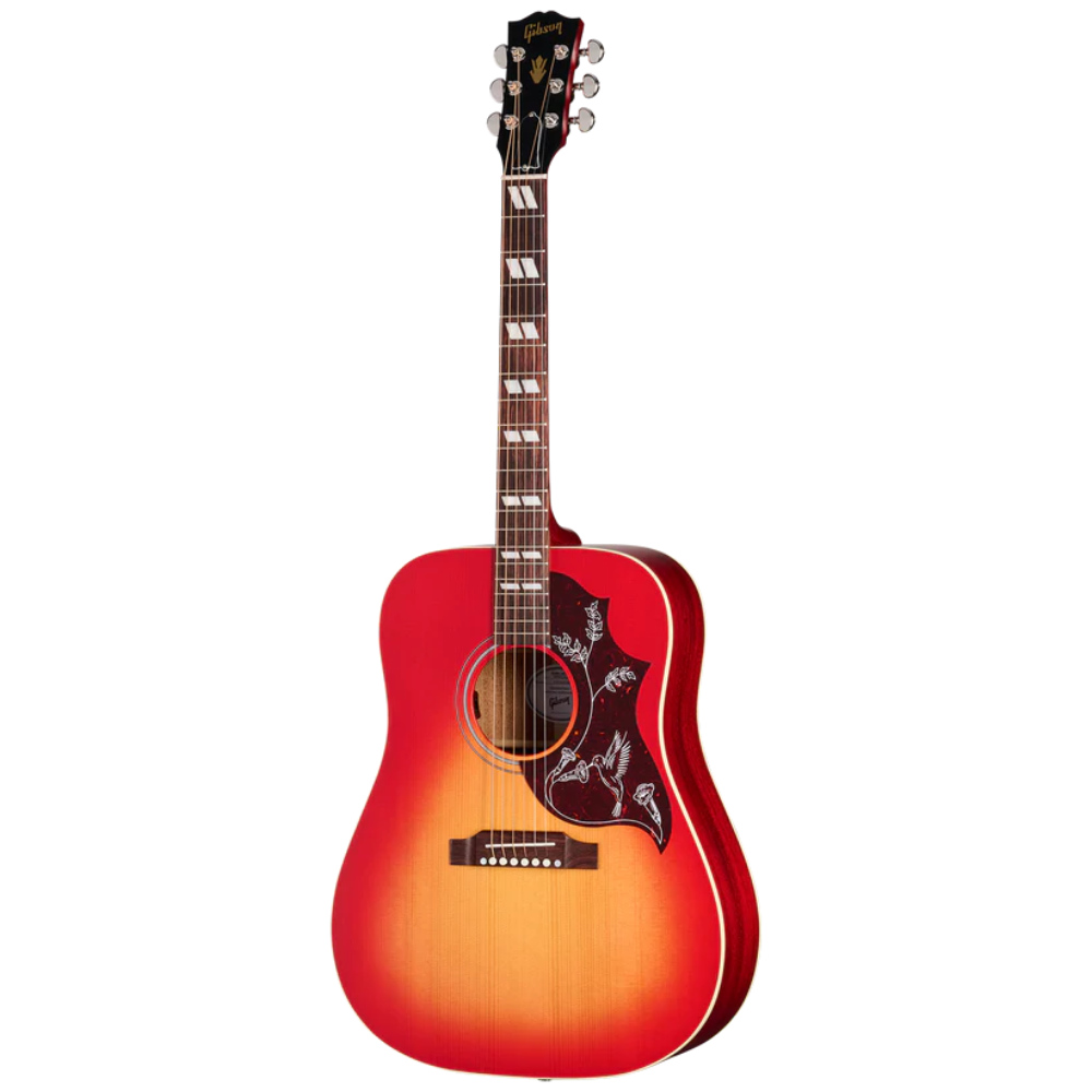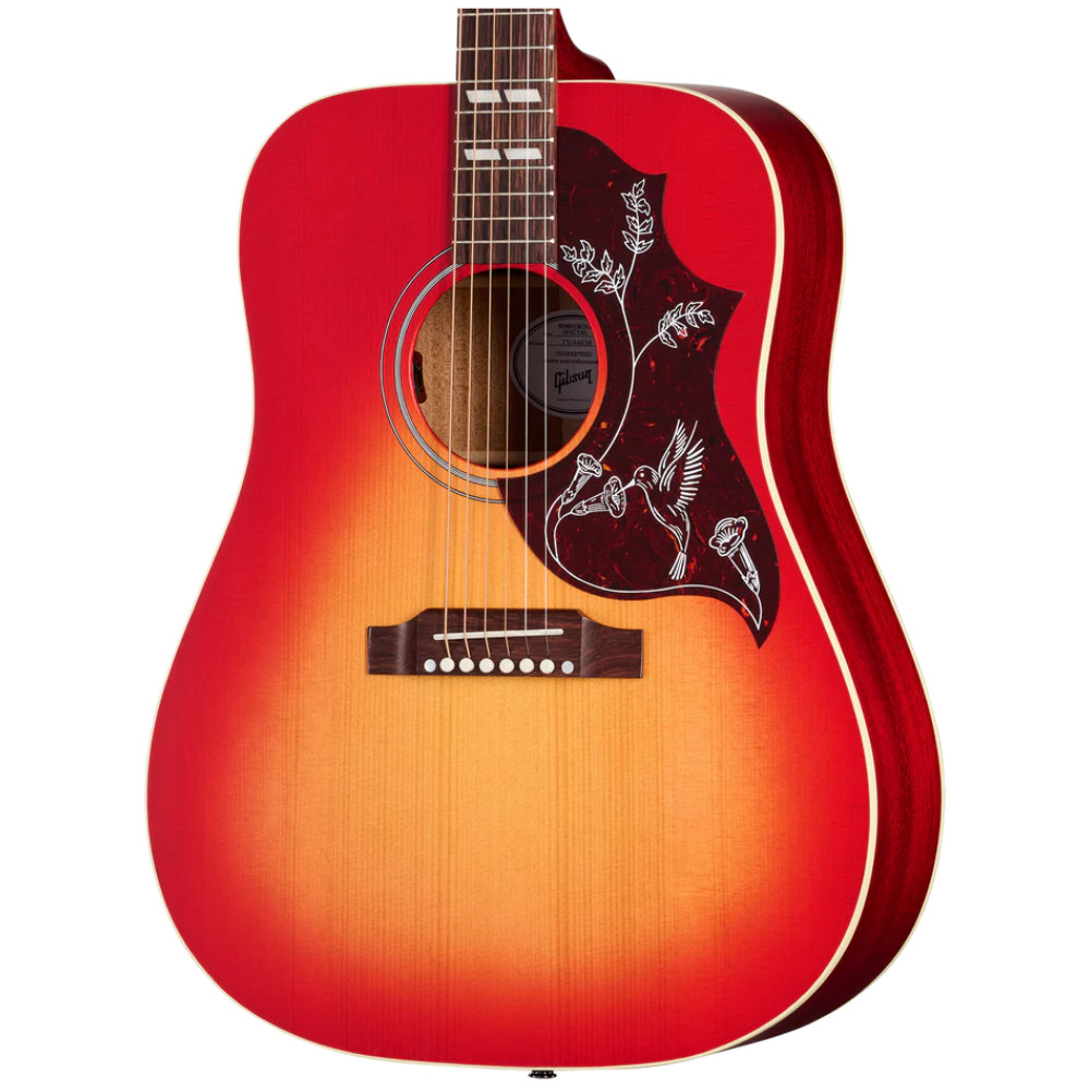 The Hummingbird Special has a traditional square-shouldered body constructed using genuine solid mahogany for the back and sides and a solid Sitka spruce top that is reinforced with our traditional scalloped X-bracing. This combination of tonewoods delivers a warm, balanced tone with excellent dynamic range that is perfect for any style of music. The “concert depth” body is slightly thinner than the body on a Hummingbird Standard, giving it a leaner and tighter bass response that sits perfectly in the mix and also makes it easier to hold. The utile neck is attached to the body with a compound dovetail neck-to-body joint, and like all Gibson acoustic guitars, it is affixed with hot hide glue. The neck has a comfortable Round profile, and the rosewood fretboard has a 12” radius and features pearloid parallelogram inlays, which is one of the visual hallmarks that makes the Hummingbird easily recognisable. The fretboard is fitted with 20 standard frets. The traditional belly-up rosewood bridge is equipped with a TUSQ® saddle, and the nut and bridge pins are also TUSQ. High-quality Grover® Rotomatic® tuners ensure rock-solid tuning stability. The pickguard features a simplified version of the world-famous Hummingbird pickguard graphics. The Hummingbird Special is finished in satin nitrocellulose lacquer in your choice of Satin Vintage Cherry Sunburst and Satin Wine Red. It comes equipped with an L.R. Baggs™ Element Bronze under-saddle piezo pickup and active preamp with an easily accessible soundhole-mounted volume control, so it’s stage and studio-ready from the moment you take it out of the included premium soft shell case.