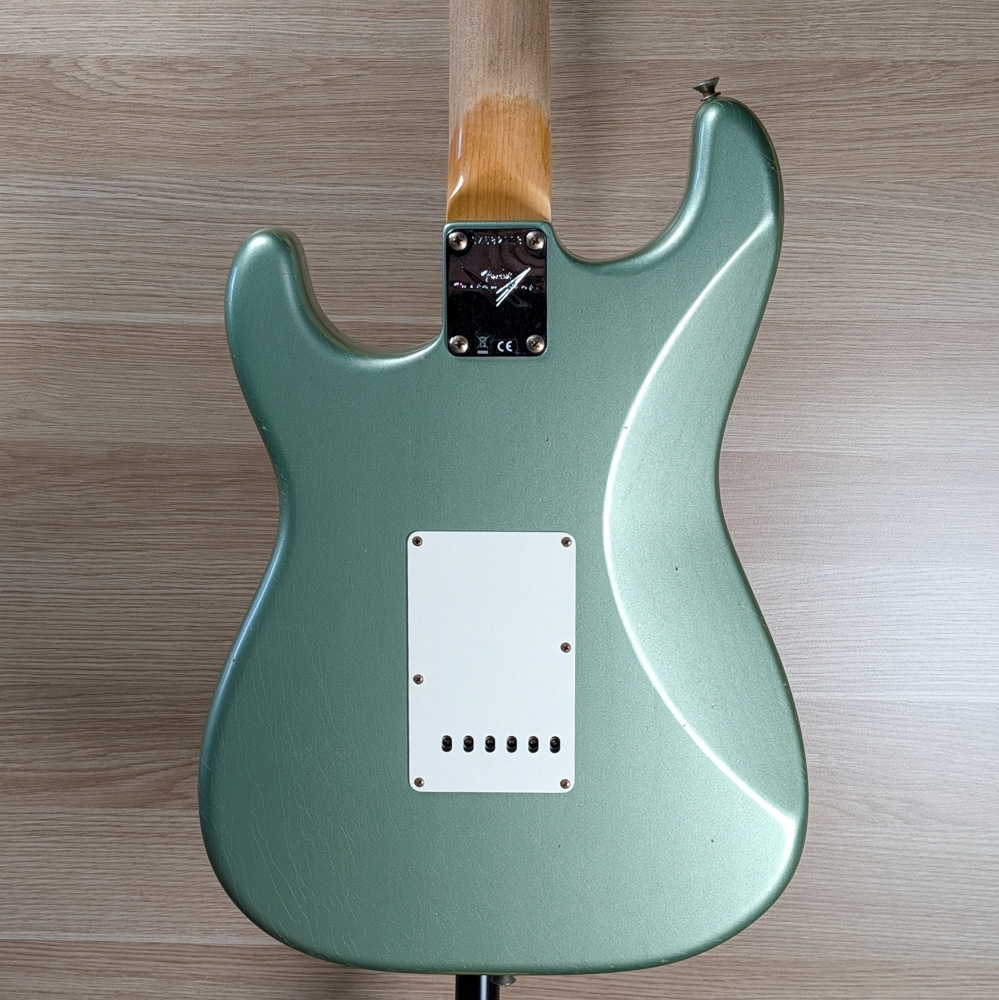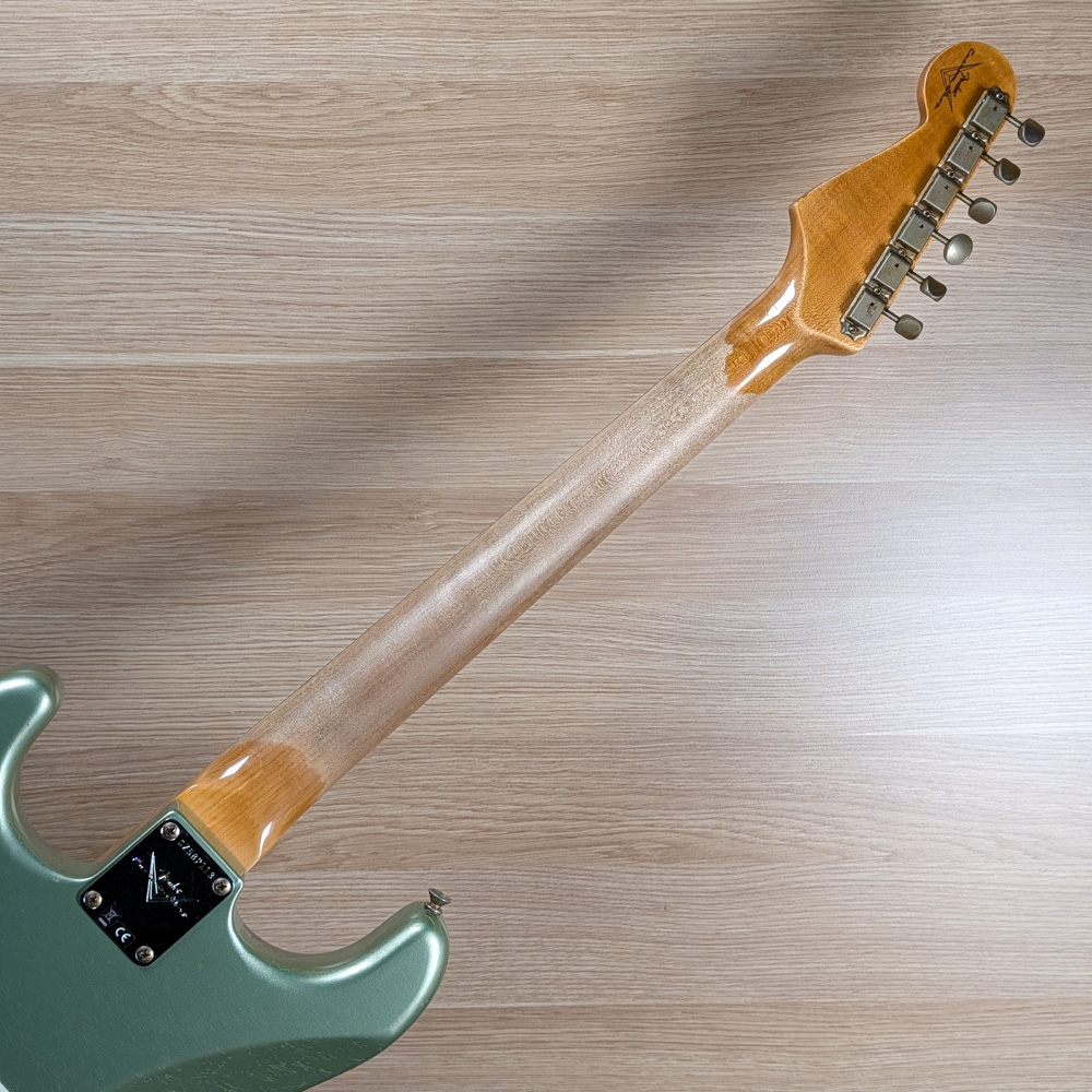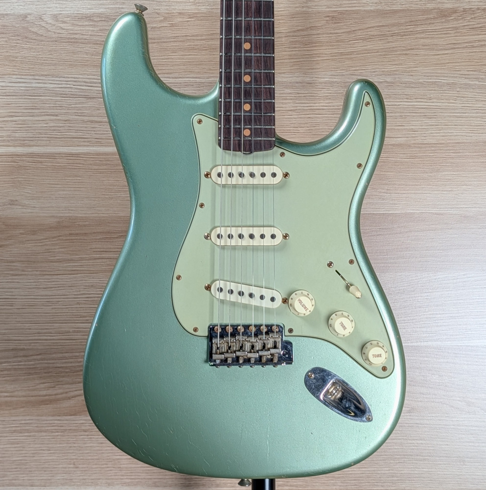 Other premium features include 9.5″ radius, 21 narrow tall (6105) frets, 5-way switch, 3-ply mint green pickguard, Custom Shop vintage synchronised tremolo, vintage-style tuning machines, bone nut, wing string tree with tall metal spacer, deluxe hardshell case, strap and certificate of authenticity.