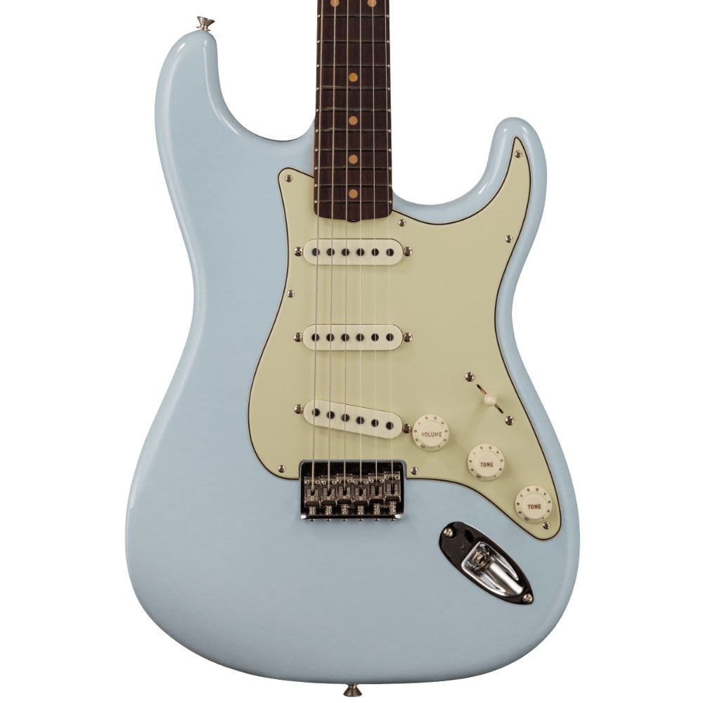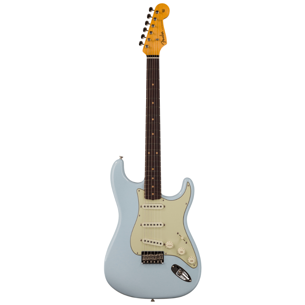 Hand-wound 1959 Strat pickups are wired to a vintage ’59 control assembly and five-way switch. Other features include Closet Classic hardware, three-ply eight-hole mint green pickguard, vintage-style hardtail bridge with patent-pending saddles, vintage-style tuning machines, bone nut and wing string tree with metal spacer. Available in Faded Aged Sonic Blue and Chocolate Three-Colour Sunburst finishes. Includes deluxe hardshell case, strap and certificate of authenticity.